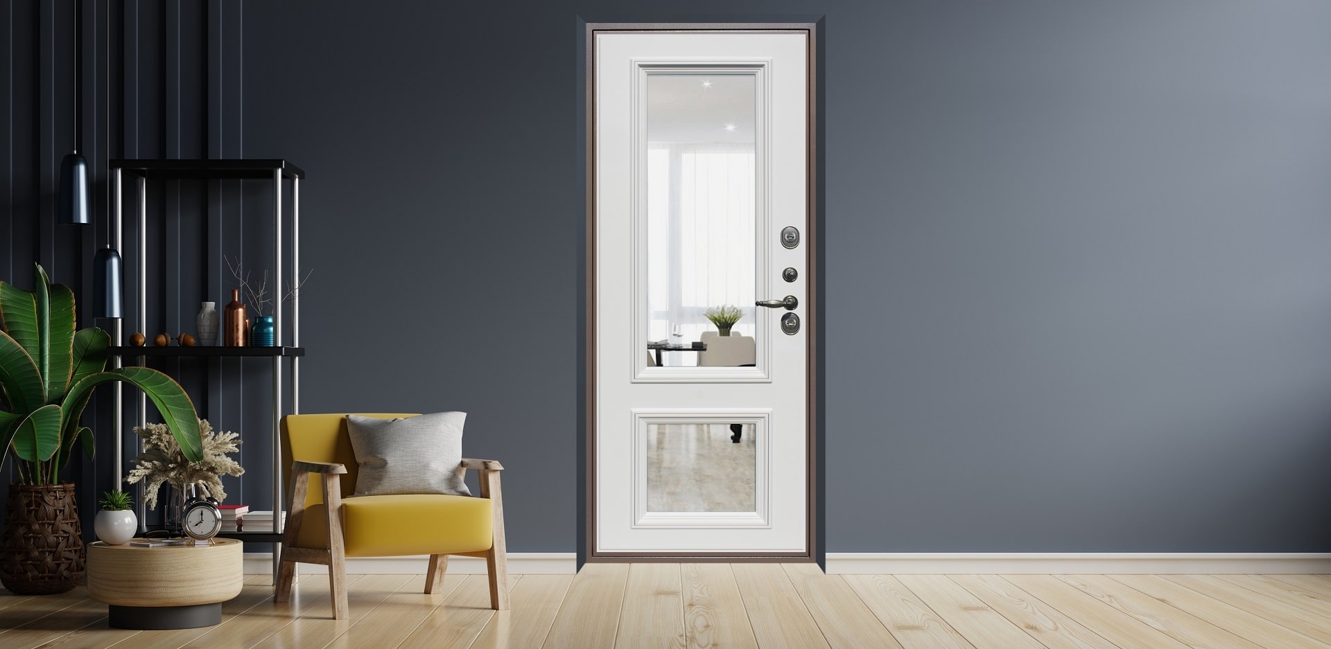 Зеркало в прихожей — это важный элемент в интерьере, который поможет Вам оценить облик перед выходом, кроме того зеркало визуально расширяет пространство и делает помещение светлее. Практичным ходом является применение Панели с зеркалом на внутренней стороне стальной дверь. Так дверь выполняет не только функцию защиты и звуко, теплоизоляции — но и эстетическую.